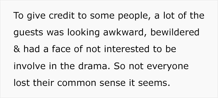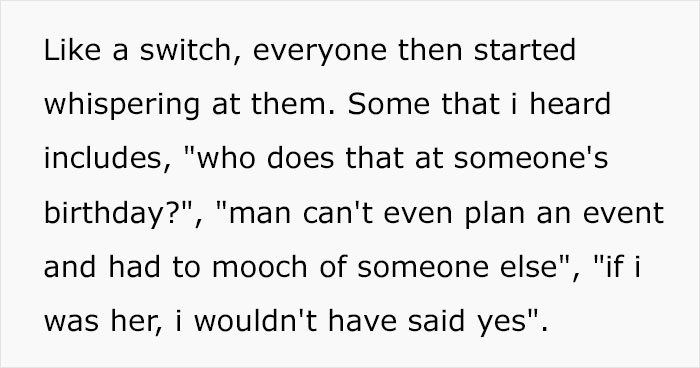 Load More Replies...I can't have any sympathy for the couple. People who do such things at another person's celebration without that person's consent. It's rude, crass, and flat out showing no respect to the person who's celebration they're attending! It's just something people should know not to do.