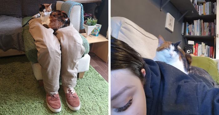 Couple Trick Their Super Clingy Cat By Creating A Fake Lap For Her To Sit On And She Loves It