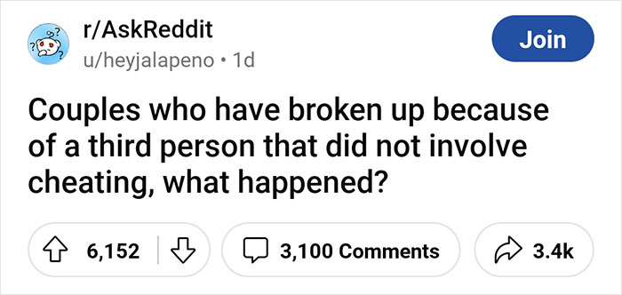 Redditor Heyjalapeno was specifically curious about this, so she started an online discussion with the question “Couples who have broken up because of a third person that did not involve cheating, what happened?” Below you’ll find the most popular answers from people who had their relationships ruined in the most uncanny of ways.