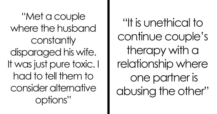 Though these professionals help many of their clients, some of them seem nearly beyond their aid. Bored Panda has collected some of the most open and honest therapists’ posts on Reddit about how they handle cases when couples have deeply troubled relationships that they might feel won’t last. Scroll down for their stories.