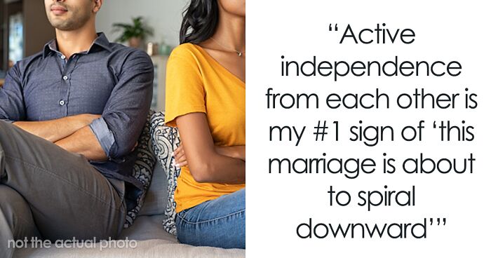 Active independence from each other is my #1 sign of “this marriage is about to spiral downward”. As soon as I realize a couple is doing things separately, like applying for car loan without the others knowledge, or planning personal trips without consulting the other, I know that the couple is soon doomed.