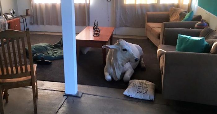 Imagine coming home and finding your cow chilling on the carpet in your living room. Not your every day afternoon, right? Well that’s exactly what Sally Webster, an Australian ranch owner, saw when she came back from a grocery shop one day. Her 8-month-old Brahman cow named Beryl was waiting for her like a puppy.