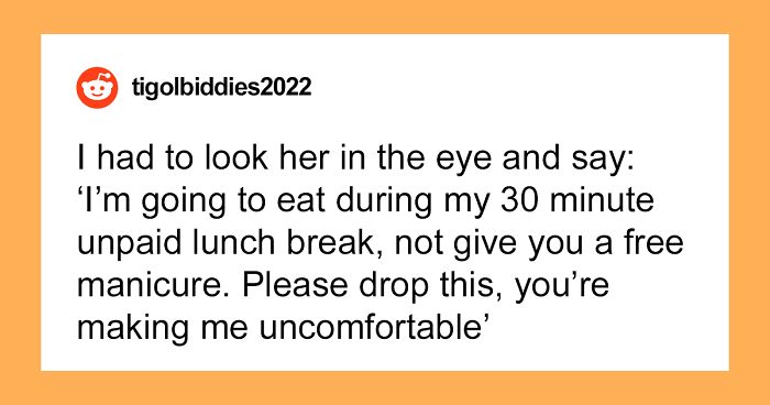 A woman shared her frustrating experience with a coworker who decided that she was entitled to a free manicure over lunch. She would pester OP over and over in some deluded attempt to get her to spend her entire lunch break and more just doing her nails, for free. Commenters attempted to figure out just how her reasoning worked.