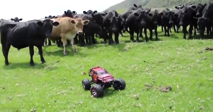 It’s easy to impress cattle: put an RC car in front of them and it becomes a cow god. This video from New Zeland shows how a simple toy car transforms into a powerful herd guide using a remote control.