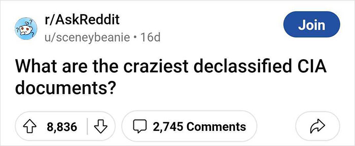 Take the discussion started by ‘sceneybeanie’, for example. The user asked members of the ‘Ask Reddit’ community about the craziest declassified CIA documents, and apparently, quite a few redditors had something to share. Scroll down to find their answers on the list below—where you will also find Bored Panda’s interview with the OP themselves—and see for yourself what captivates people about such stories.