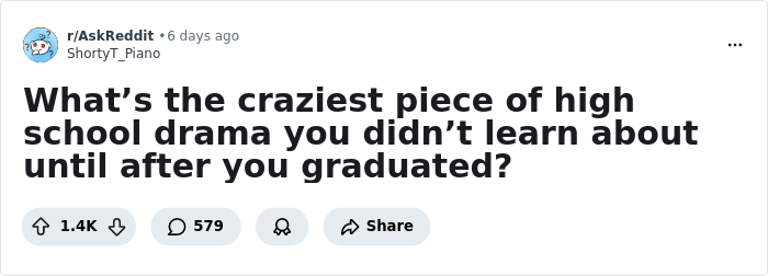 The craziest piece of drama was about *me*, and I was too busy being shuttled back and forth between divorced parents every other day to notice. Apparently multiple guys tried to get me to sleep with them, but failed because I was so uninterested in the general HS population that I didn't realize what they were trying to do. This resulted in them feeling personally attacked for whatever reason and spreading rumors that I was sleeping around, which ended up being so wide-spread and violent that we ended up having a whole assembly on harassment, with me having absolutely no idea the assembly was about me to begin with. I only found out years later when I ran into a guy at the grocery store and he apologized to contributing to said rumors about me. I really wish I could adequately describe the look on his face when he realized I actually had no idea what he was talking about.