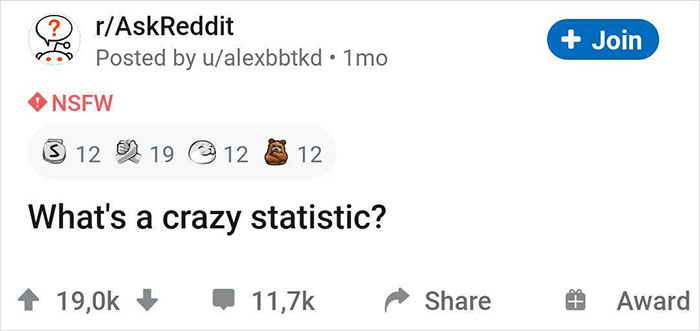 In October, Redditor u/alexbbtkd asked other platform users, "What's a crazy statistic?" and has received plenty of answers. We've combed through all of them and picked out the most surprising ones just to broaden your horizons. So put on your smarty pants, get a notebook, and enjoy!