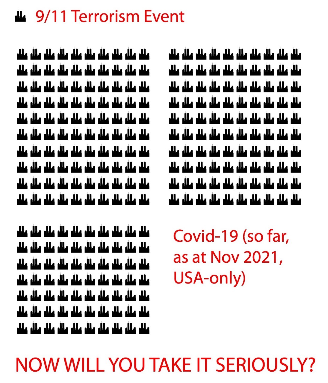 It's very sad that a country is willing to engage in active warfare to "honour" the roughly 3000 people who died in 9/11....but they're not willing to enforce a vaccine or mask mandate to do the same for the 777 000 people who've died of Covid related complications.