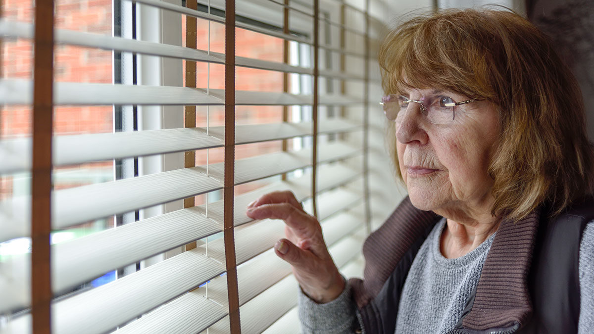 Elderly woman peering through blinds, representing crazy neighbor in a legal conflict scenario.