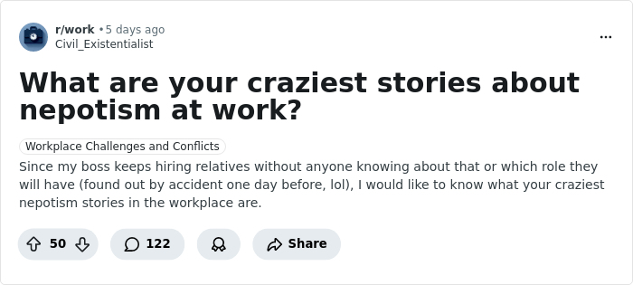 In an enlightening thread on the ‘Work’ subreddit, people shared the worst cases of workplace nepotism and favoritism that they’d ever seen. Keep scrolling to check out their stories, and be sure to share these with your work BFFs.