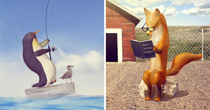 Kim says, “In my compositions I use photographs, illustrations, and even ‘3D sculpts’ made in zBrush. I’ve made collections of hundreds of surreal images that share my crazy imagination, and sometimes I even build different worlds that I’d love to live in. Animal humor is a particular interest of mine, and I love to place them in human situations, using puns and visual jokes to bring them to life.”