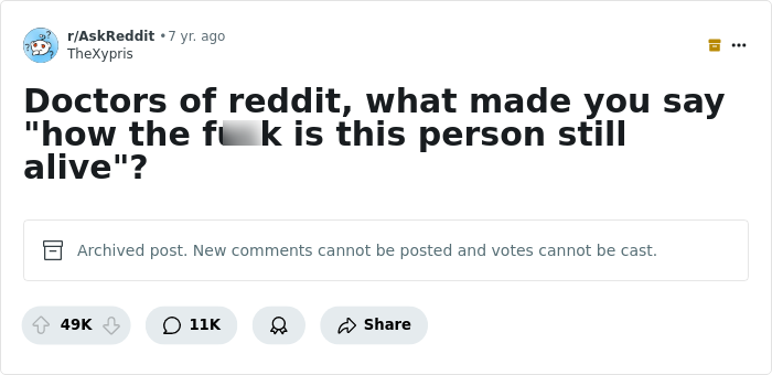 “How Are They Still Alive?”: Doctors Share 50 Stories Of Patients That Survived Against All Odds Not a doctor but my father is.