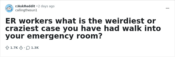Bored Panda has compiled the most interesting answers from an online thread where someone asked: "ER workers, what is the [weirdest] or craziest case you have had walk into your emergency room?" The tone of the answers goes from unexpectedly hilarious to seriously disturbing and heart-wrenchingly sad at times. So, Pandas, proceed with caution.