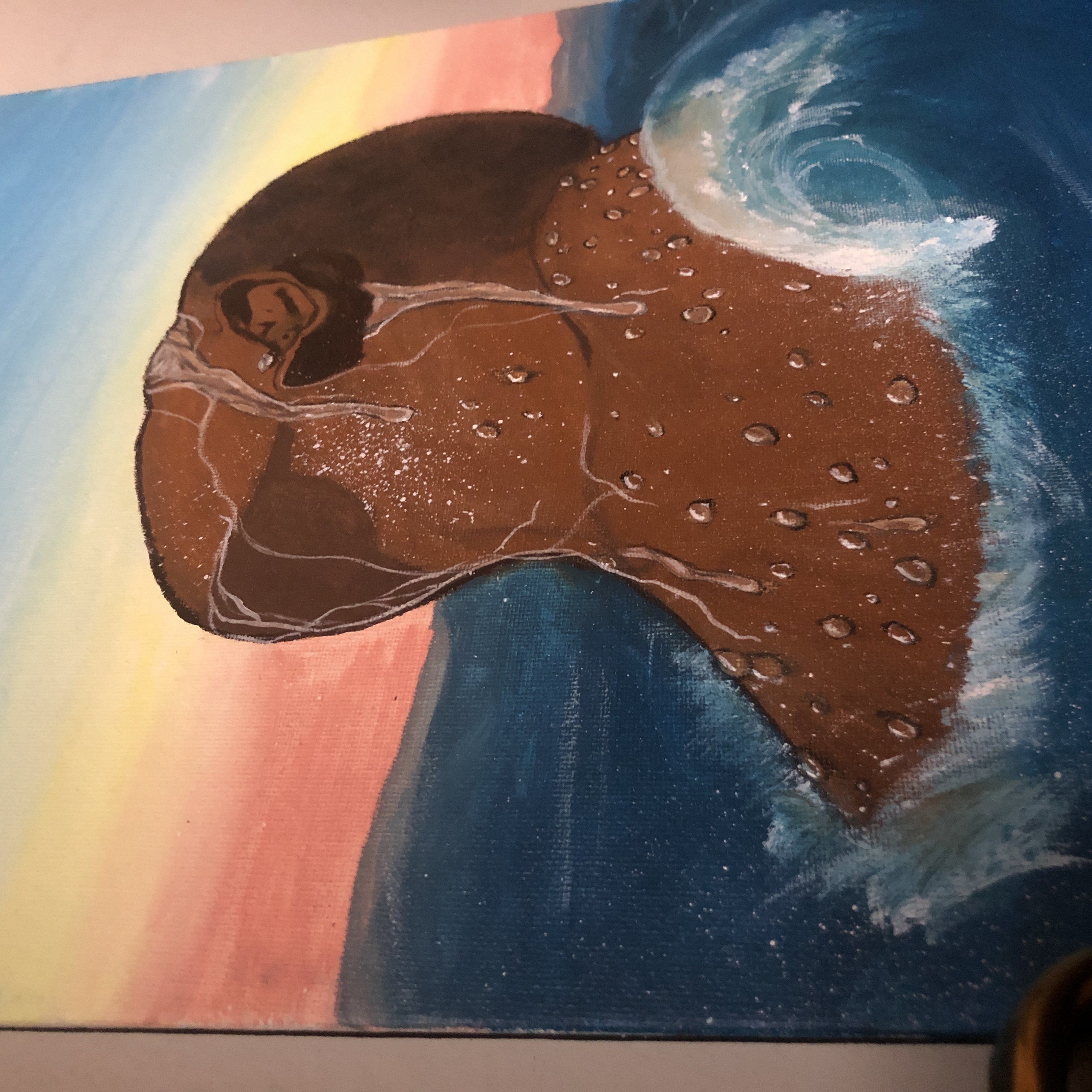 Hello, I’m Omi and I’ve been creating since I was about 6 years old. I was introduced to art by my older cousins who were really into graffiti and drawing people. I enjoy exploring different mediums and seeing what piece comes out of the experiments. I currently do portraits in graphite and just started painting a little over a year ago. This piece is the longest I’ve ever spent on a painting (3 months). It was also a piece full of trying new things like painting waves and droplets.