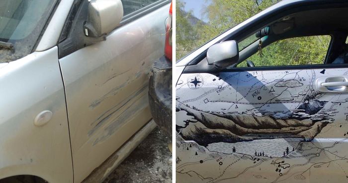 Humans are a pretty resourceful bunch, especially when it comes to “fixing” stuff. Take this guy in Russia for example. When a truck hit his car in the Altai Republic near Kazakhstan and Mongolia, he didn’t take his vehicle to the garage to get the damaged door replaced. No. He decided to fix the problem himself. How? By taking a permanent marker pen and covering the unsightly dent with a detailed map of the region!