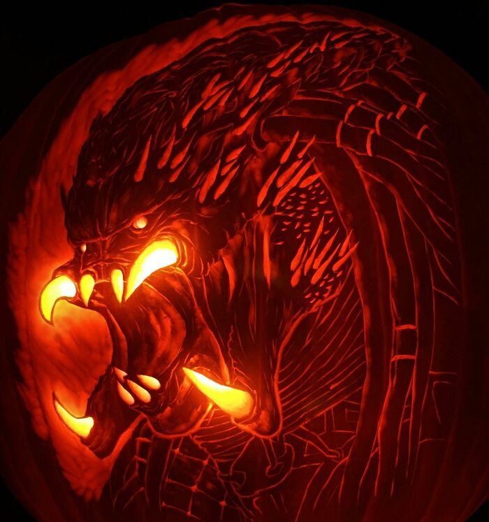 My Dad Carved Alien Ten Years Ago, But Now He’s Come Full Circle And Carved Predator For His Yearly Pumpkin Carving. Happy Halloween