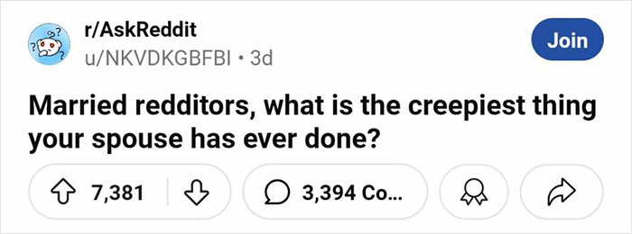 To find out how this conversation started in the first place, we reached out to Reddit user NKVDKGBFBI, who invited others to share stories of the creepiest things their spouses have ever done. They were kind enough to have a chat with Bored Panda and share why they posed this question.