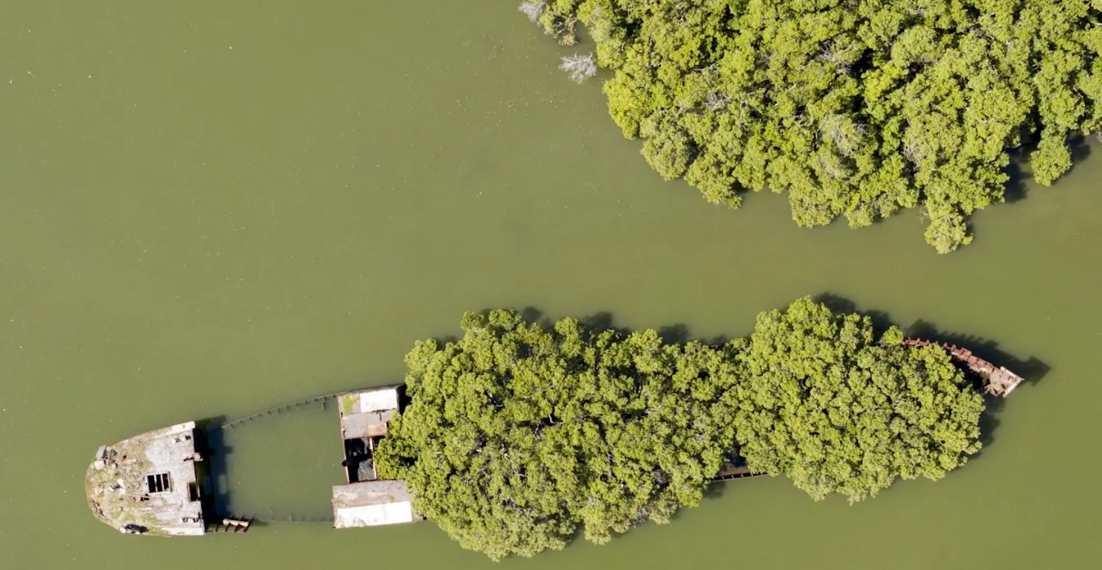 Built and launched in 1911, this ship was used to transport supplies during WWII before being returned to service as a steam collier after the war. Its last recorded use was in the early ‘70s, and since then, the abandoned ship has floated in the bay with magnificent mangrove plants filling its hull.