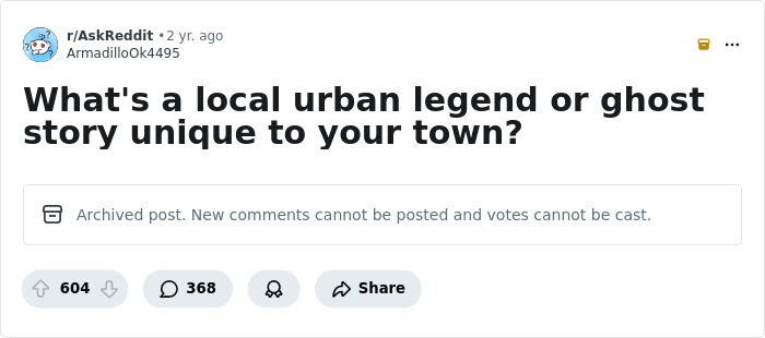 Urban legends and ghost stories have a way of turning ordinary hometowns into creepy places fit for the scariest of Halloween celebrations. Someone asked, "What's a local urban legend or ghost story unique to your town?" and the answers came flying in faster than witches in the night. From the "Crucified Cat" to "Sarah's Grave," people have been letting their local skeletons out of the closet.