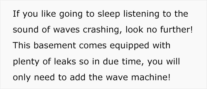 However, the real estate agent Laura decided to take a different approach. She took all the flaws and made it sound like living in the house would be like an adventure, because when you sleep at night, you will feel like you’re living by the sea as the pipes leak and create a wonderful calming sound of waves.