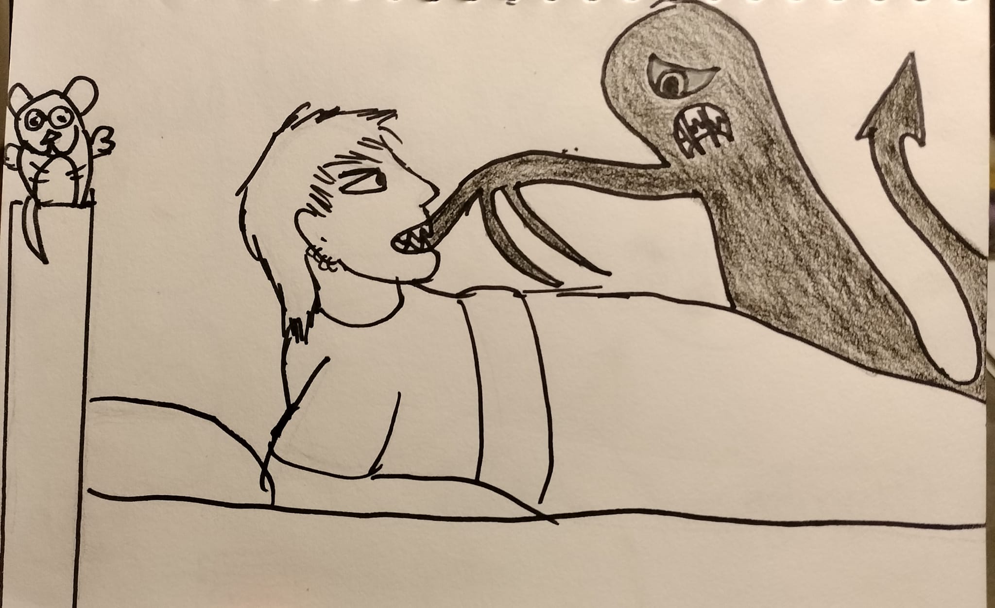 I share a reoccurring nightmare with my twin about the Licorice man from Candy Land chasing after me (HER in her dream) in our high school. He would chase us for hours, trying to get the best of us. He looks nothing like the actual licorice man from the board game—he is made of licorice and it coils around him. The licorice looks a bit like ennard from fnaf… all wires. He had red glowing eyes. He would chase me into the bathroom and I’d hide in one of the stalls. He would slowly open one after the other until he got to ours. He already knew I was in the stall but wanted to scare me even more. He’d throw open the stall, grab me, and i’d start turning to licorice and wake up. My twin and I had this same nightmare for years without telling each other. We were terrified when we found out the other was having the same dream. My twin thinks it was a demon and she isn’t even religious.