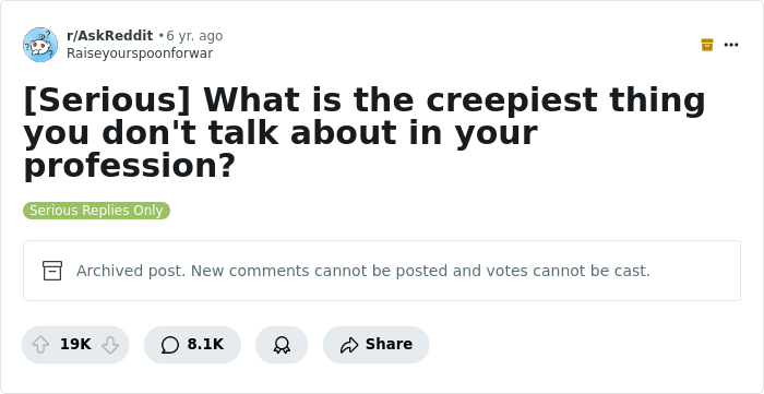 Workers took to a thread on AskReddit to spill the tea about the creepiest parts of their professions. It’s the kind of stuff most people don’t talk about, unless they’re anonymous.