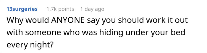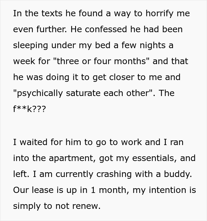 Karl’s weirdness didn’t just stop there. His crazy justification for lying under OP’s bed for months was that he wanted them to be psychically saturated with each other. Some people do believe that you can use the law of saturation to attract other folks. It definitely doesn’t involve creepily hiding under their beds. It is mostly about self-love and positive vibrations, none of which Karl did.