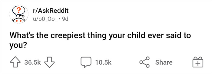 I guess kids saying creepy things is going to be a weekly thing on Bored Panda? Like the bridezilla stories, selfish spouse stories, in-laws behaving badly stories, etc. You guys are really in a rut.