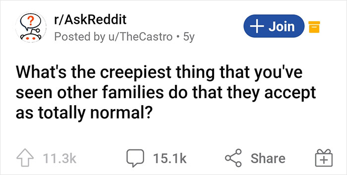 In this viral thread, user TheCastro asked what's "the creepiest thing" people have seen other families do without realizing how strange it was, and thousands of replies started pouring in. Whether it's mandatory cuddle time or weekly family adult movie nights, these stories sit pretty high on the oddness scale.