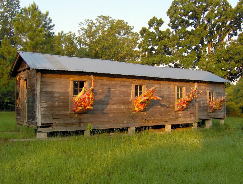 I looked this up on Reddit. It was originally an art project! Here’s the copy/paste about it. "Burning House, a site-specific artwork/installation by SFA alums Clint Alexander and Emily Sloan Alexander, is located on the east side of Hwy. 59 about 40 miles south of Lufkin, between Seven Oaks and Legget. It is a permanent installation. The pair of artists added flames, made of canvas wrapped around fencing and then painted, to the 19th century shotgun house to create 'contemporary folk art, examining the socio-economic beginnings of East Texas and creating a new life of such relics through the creation brought through pseudo-destruction. It is also a form of activism, bringin art into under-represented areas,' Sloan Alexander said."