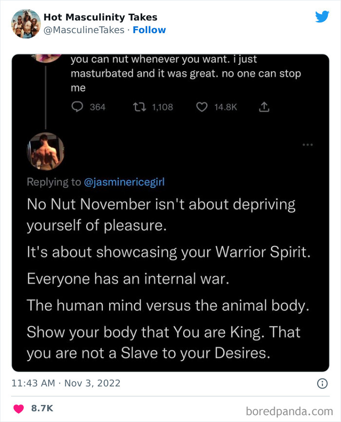 Thanks to one illuminating corner of Twitter called 'Hot Masculinity Takes,' we get to see a galore of absurd cases when this happens online. "Welcome to the Alpha Zone," says the account’s description, and you already know it’s gonna be a wild ride. So continue scrolling to check out the absolutely ridiculous opinions about men on the Internet, and don’t miss the chat we had about masculinity with licensed clinical psychologist Dr. Jesse Matthews right below.
