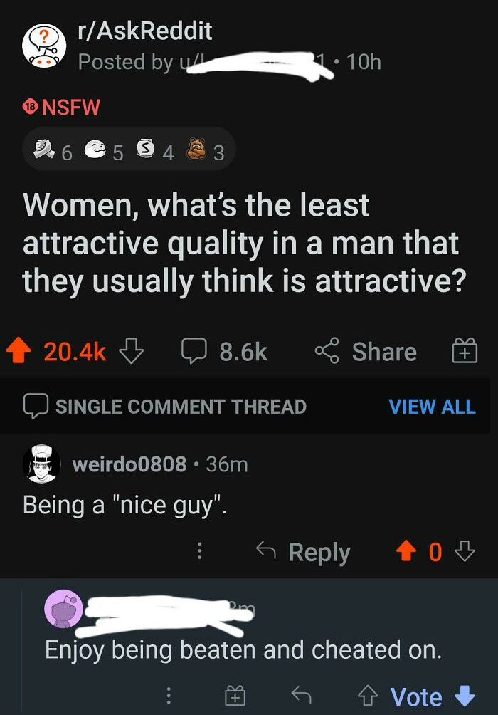 Load More Replies...These kinds of posts concern me... it really is disturbing that there are so many men/boys out there with a skewed sense of entitlement in regards to women. I take women to dinner(and they sometimes take me) and spend time with them because I like them and enjoy their company...