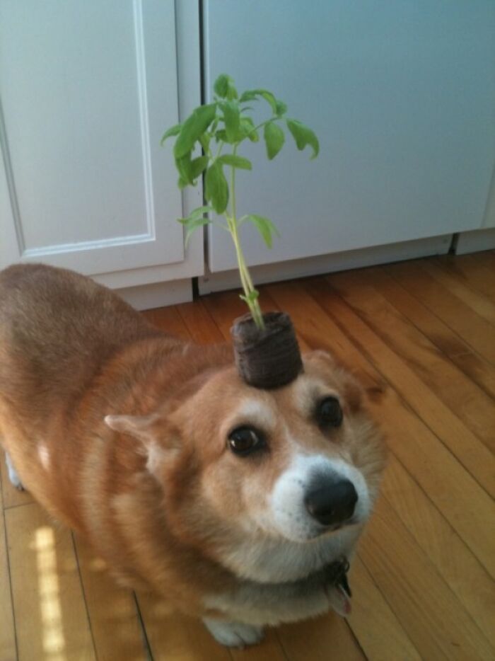My Friend's Corgi Ate Pumpkin Seeds, Pooped Them Out, And They Started Growing. Here She Is Sitting Next To Her Work