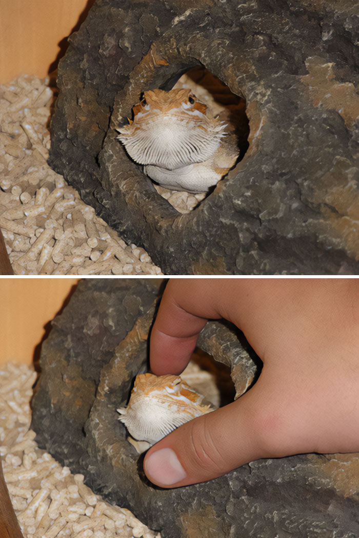 Rare Moment Captured This Morning As Our Cat (Who Is Very Shy) Booped Our Bearded Dragon (Who Is Always Sleeping Under His Rock)