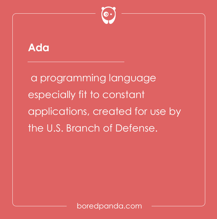 Ada — a programming language especially fit to constant applications, created for use by the U.S. Branch of Defense.