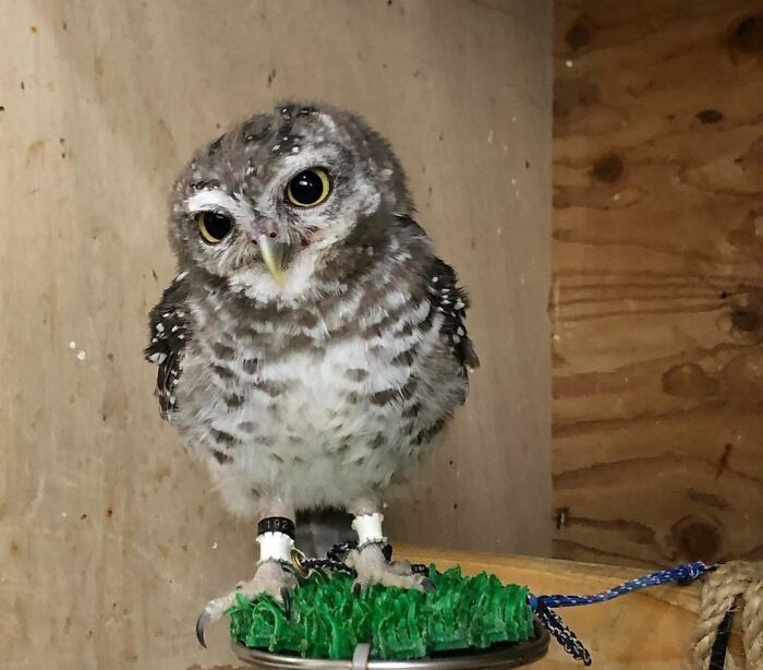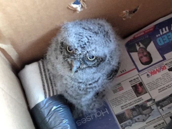 My Friend Rescued A Baby Owl. He May Not Be As Cute As The Other Owls But I Think He's Got Some Personality