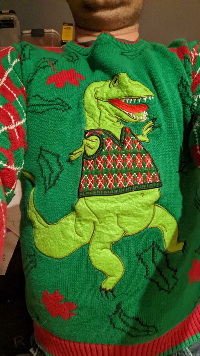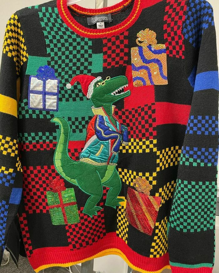 I Just Imagine The Design Meeting For This Sweater: "The T. Rex Isn't Festive Enough." "Could We Add A Disco Ball?" "Bingo"