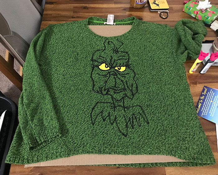 Hand Painted Grinch On The Ugly Green Sweater I Found At Goodwill. All For My Ugly Christmas Sweater Party This Sunday