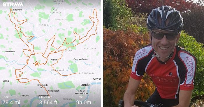 This cyclist, Anthony Hoyte from Cheltenham, has quite an interesting hobby of drawing images on fitness apps by pedaling around
