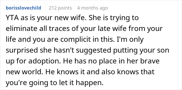 The poster explained that his first wife had passed away two years ago and that his son, who had been close to her, took it very hard