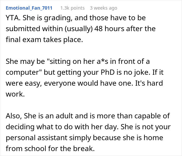 Load More Replies...Grad school is time consuming and exhausting!!! You do more work outside the classroom than in it, A LOT more work. And she is working too! I sympathize with the daughter. Yes, a lot is sitting at a computer, but you can be mentally drained too which can lead to being physically tired. My work now is not physically taxing but, boy oh boy, it is emotionally draining at times. All that said, these are favors/requests and not demands. He needs to show her more respect as an adult. It sounds like she was willing to help, she just couldn’t drop everything and do it that second. I hope they find a middle ground and he learns something from this AITA so they can have a relationship.