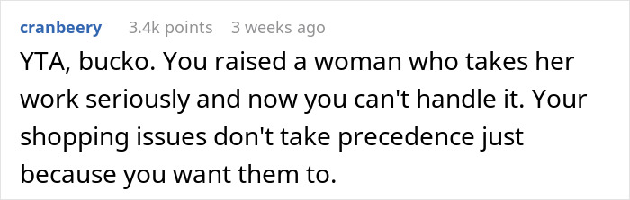 Load More Replies...Do you really need to ask if yta? Your adult daughter does not owe you her time. She comes home and you treat her like a child. Good luck maintaining a relationship with her. Grad work is hard and even if she has 30 minutes to spare, you should not expect her to fill it with your errands.