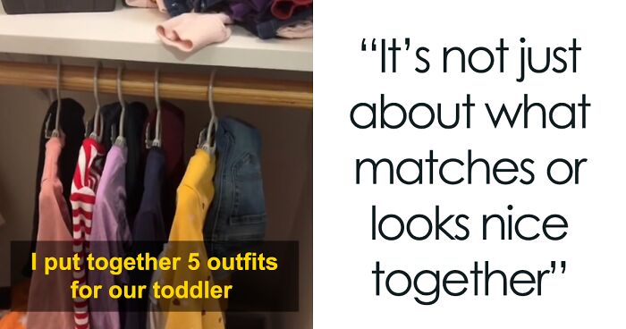 “And since she’s going to have to wrangle both kids in the morning, I put together 5 outfits for our toddler. By the way, for the partners watching this who don’t usually put together outfits for their kids, it’s not that simple. It’s not just about what matches or looks nice together. I looked at the weather report to base these outfits. Like, Wednesday is a light shirt and pants because it’s going to be warm and it’s not going to rain, so they’ll be out on the playground. Friday, it’ll be cold, so a heavier pant, a long-sleeved T-shirt and a sweatshirt.”