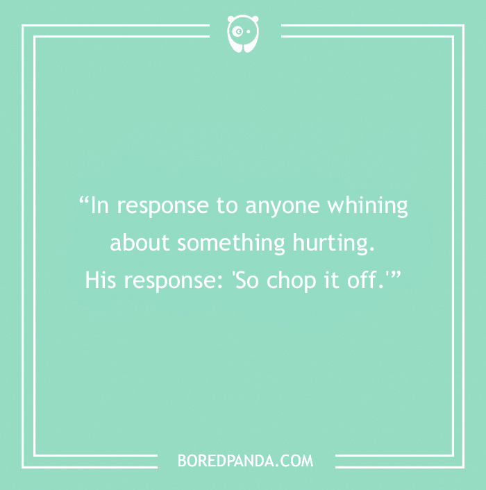 "In response to anyone whining about something hurting. His response: 'So chop it off.'"