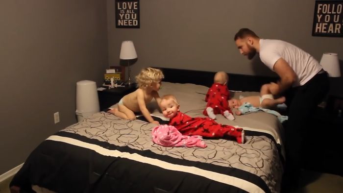 We have already showed you what parenting really looks like, and it ain’t all sunshine and bubblegum. There are only a few people who know this better than Dan Gibson and his partner Corrie Whyte. The couple lives in Cambridge, Ontario and has 4 children: toddler, Emily, and triplets, Jackson, Olivia & Levi. “Anybody who has one baby, two babies, or more, they really understand the struggle of going through a diaper change or getting them ready,” Gibson says. Don’t you feel tired just watching him dressing the gang up?