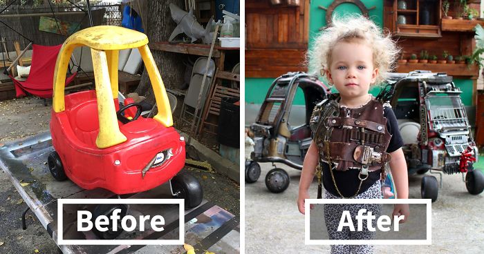 Inspired by Mad Max, obviously, father Ian Pfaff started off with the classic Little Tykes Cozy Coupes. He then used anything he could find, from old computer junk to an espresso machine, and used them to spice up the basic kid cars. The result? Two completely badass-looking Mad Max: Fury Road vehicles that look like they’re straight from the movie! And we must say, Ian’s kids look pretty hardcore behind the wheel.