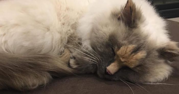 It didn’t go unnoticed that the cat’s face looks rather explicit, which is probably what prompted this adorable 9-year-old feline to go viral. The beautiful ragdoll cat has white and grey fur with a distinctive brown shape across her face which ends just at the tip of her nose.