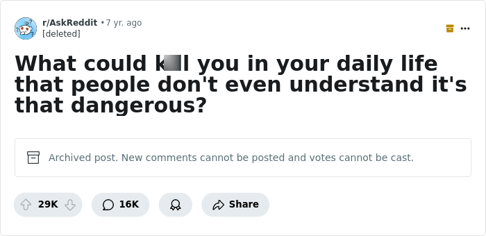 The original thread appeared on the AskReddit community quite a long time ago, and during this time, probably many new potentially dangerous things have appeared (suffice it to say that the thread is pre-Covid). However, the question "What could k**l you in your daily life that people don't even understand [is] that dangerous?" collected over 29K upvotes and around 16K different comments.