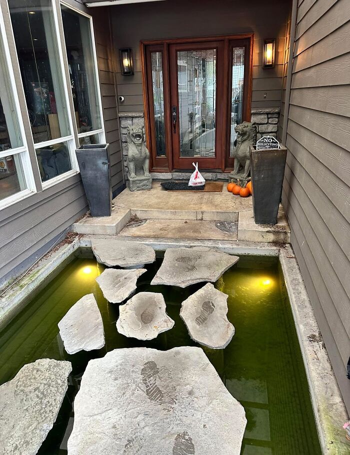 Stepping stones over water lead to a wooden door with statues, showcasing a challenging stairs design.