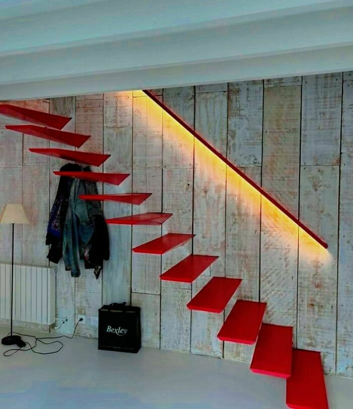 "Steep stairs with irregular steps and red railings, known as 'death stairs', in a modern interior setting."